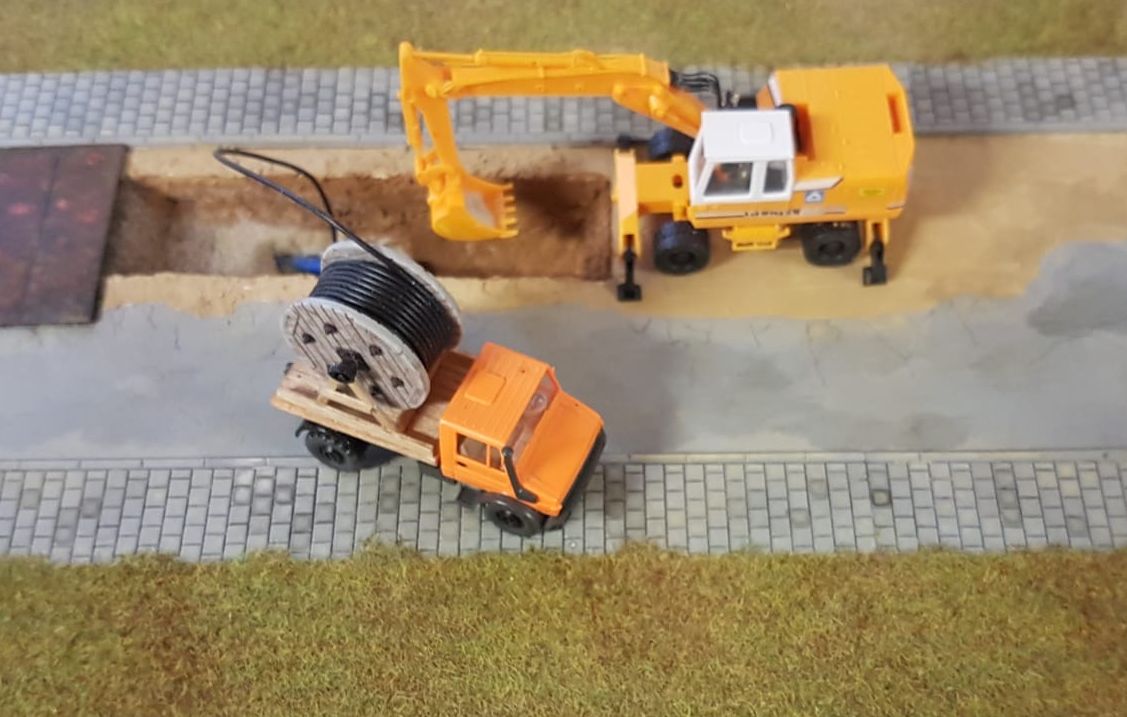 In unserem kleinen Szenario auf 20 x 30 cm wird ein Straßenzug einer Ortschaft, es könnte durchaus auch Karlsdorf oder Neuthard sein, mit superschnellem Glasfaser ausgebaut.
